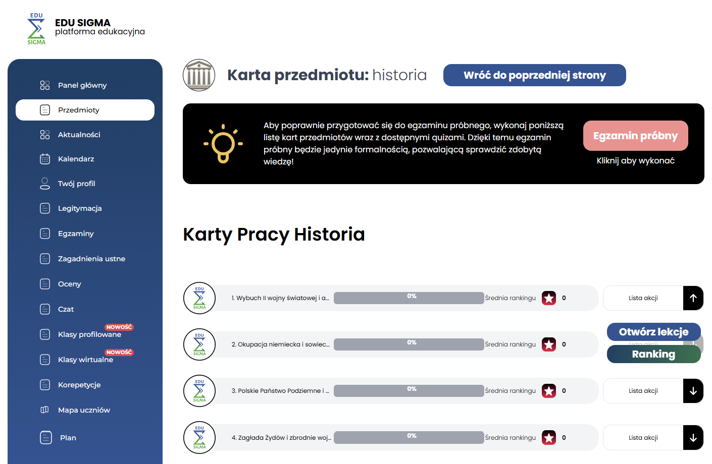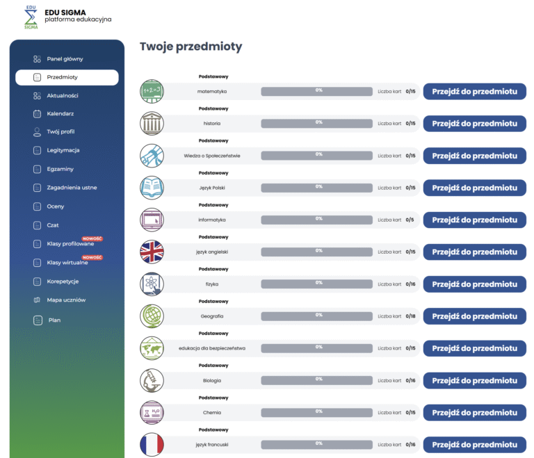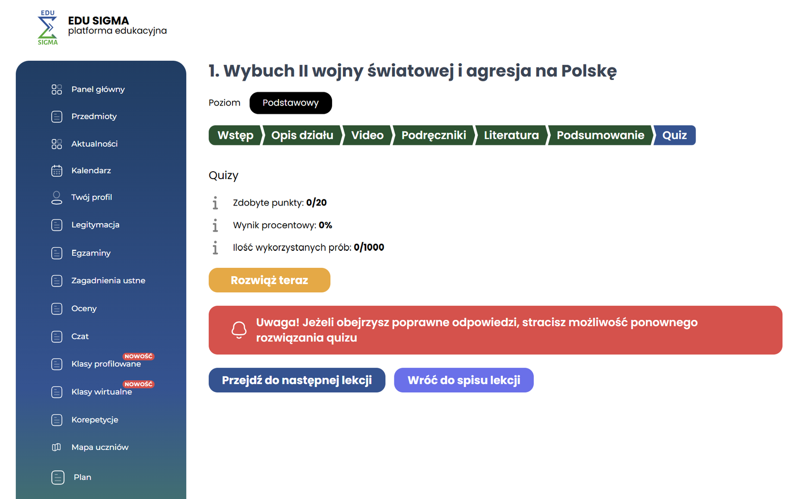 Po wybraniu konkretnego przedmiotu – czy to matematyka, biologia, historia czy język obcy – uczeń klika “Otwórz lekcję” i przenosi się do przejrzystego i interaktywnego modułu lekcyjnego.