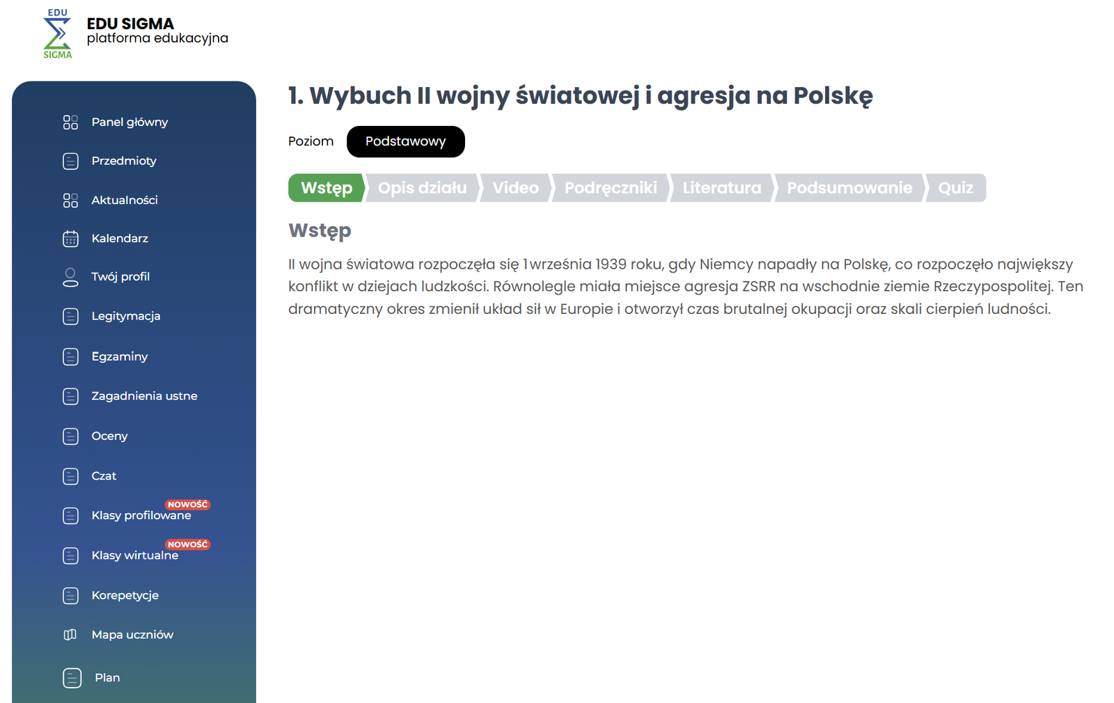 Po wybraniu przedmiotu i kliknięciu „Otwórz lekcję” uczeń zaczyna od wstępu do działu. To krótka, ale treściwa część, która wprowadza go w tematykę. Zakładka wstęp jest swego rodzaju drogowskazem po całym materiale.
