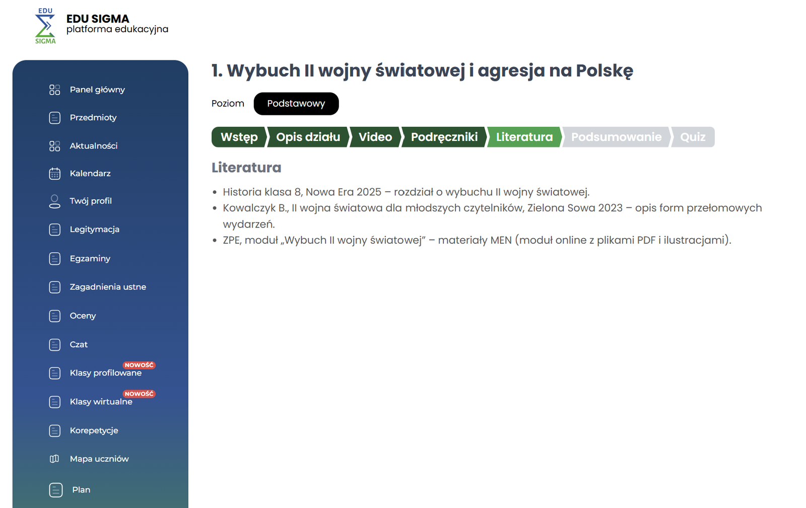 Sekcja literatury pokazuje, w jakich książkach, publikacjach i źródłach najlepiej opisane są omawiane zagadnienia. To idealne rozwiązanie dla uczniów ambitnych, którzy chcą zgłębić temat.