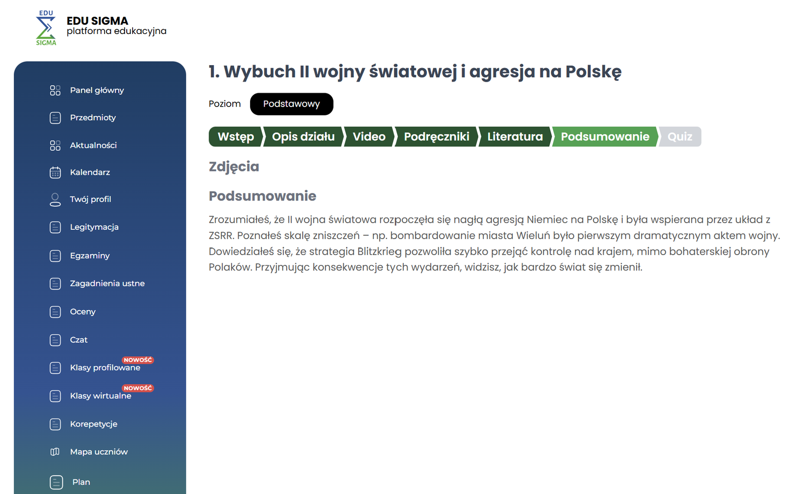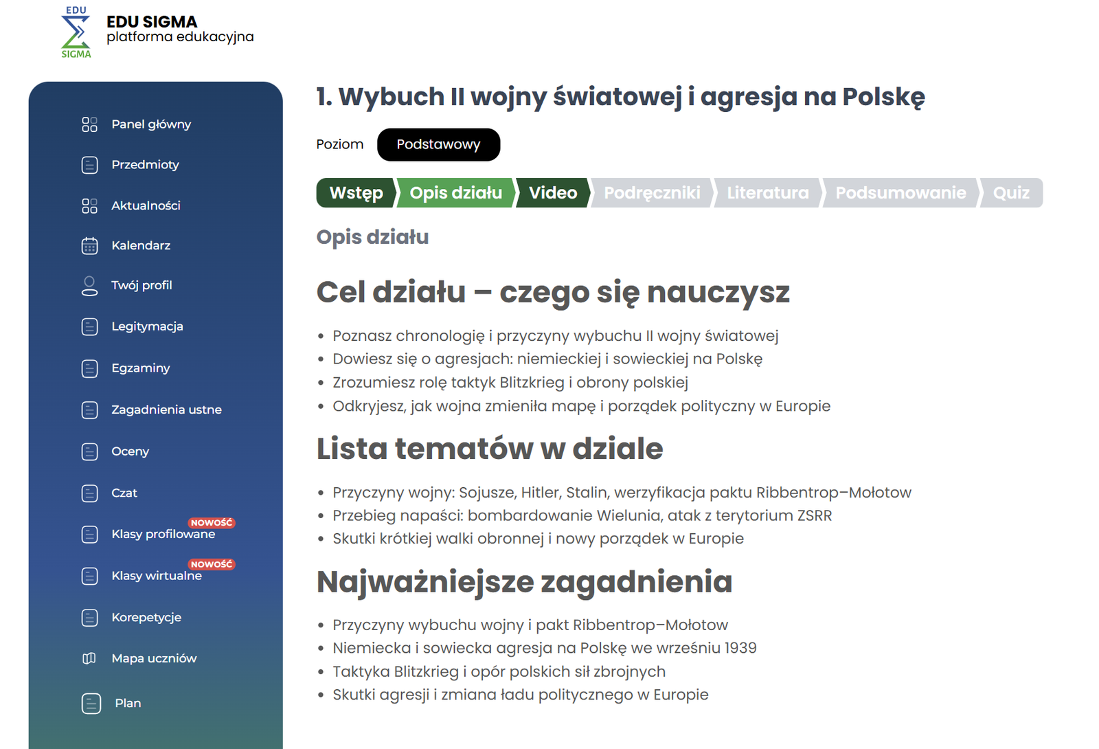 Edu Sigma to nowoczesna platforma edukacyjna, która łączy w sobie wygodę, multimedialność i bogactwo materiałów. Dzięki niej nauka staje się dynamiczna i wciągająca – niezależnie od tego, czy uczeń pracuje w domu, w klasie, czy podczas lekcji online. To narzędzie, które wspiera zarówno uczniów w samodzielnej pracy, jak i nauczycieli w przygotowaniu i prowadzeniu zajęć.