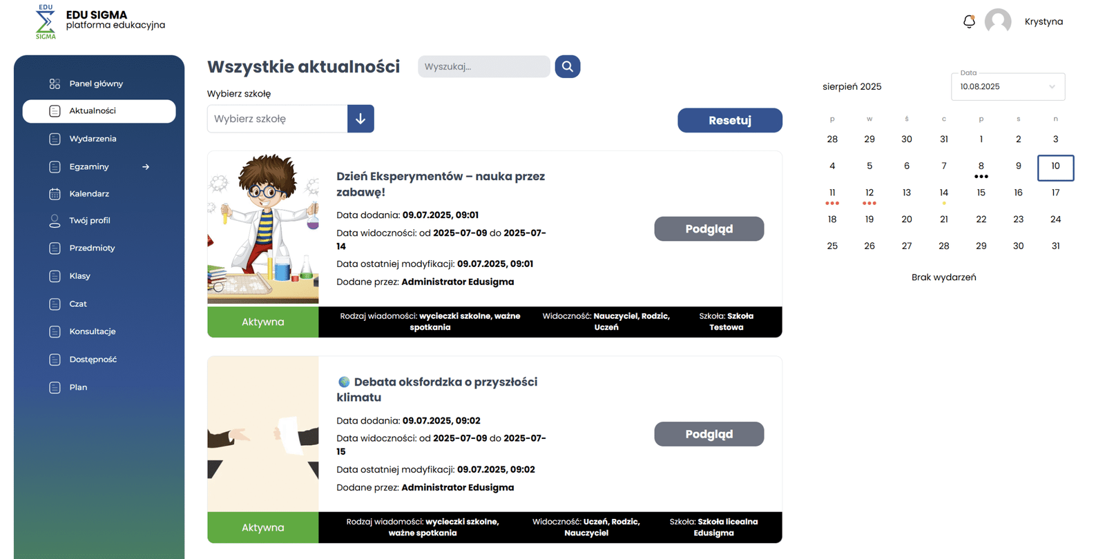 W zakładce „Aktualności” nauczyciel ma dostęp do wszystkich ogłoszeń i komunikatów publikowanych przez szkołę. Mogą to być informacje o wycieczkach, zebraniach z rodzicami, ważnych wydarzeniach, spotkaniach zespołów nauczycielskich czy ogłoszeniach wewnętrznych.