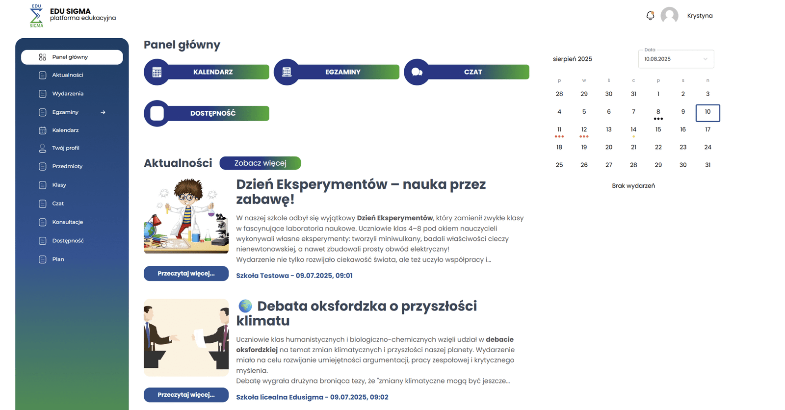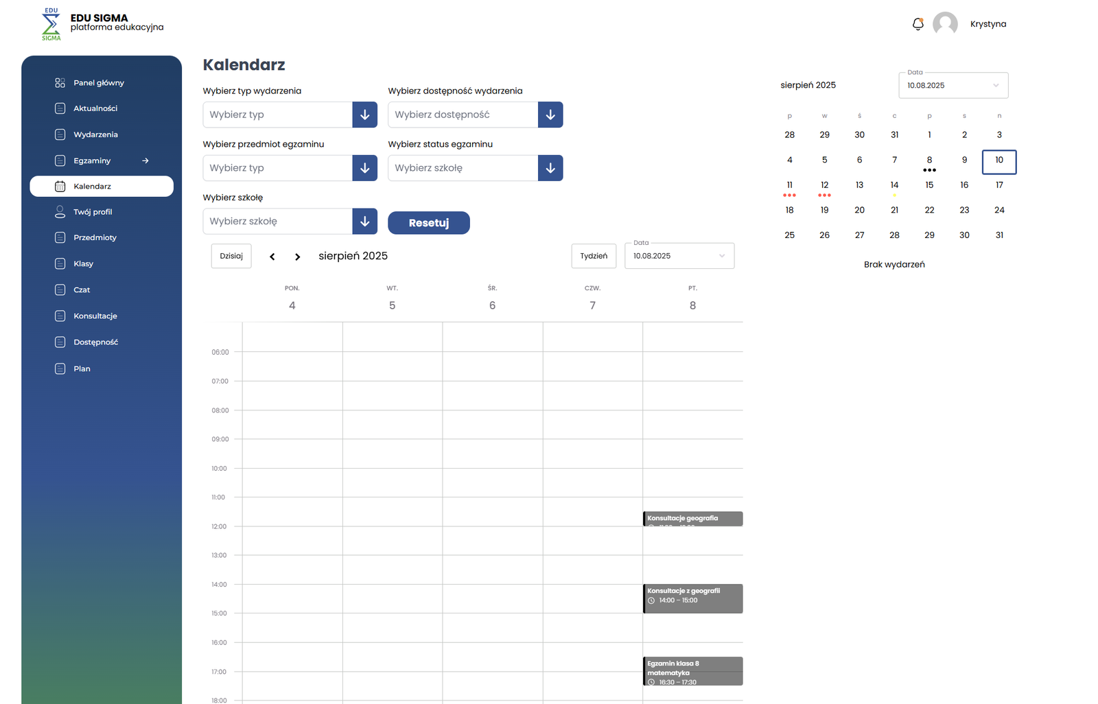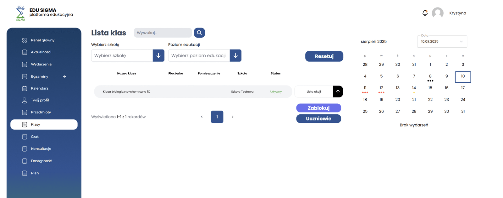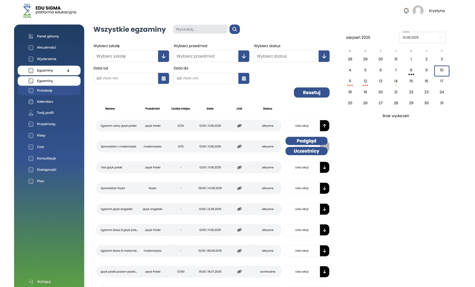 Dodatkowo dostępna jest wyszukiwarka, która umożliwia szybkie odnalezienie konkretnego wydarzenia lub egzaminu. Zakładka „Kalendarz” pozwala efektywnie planować swoją pracę i sprawnie zarządzać czasem w obrębie różnych szkół i klas.