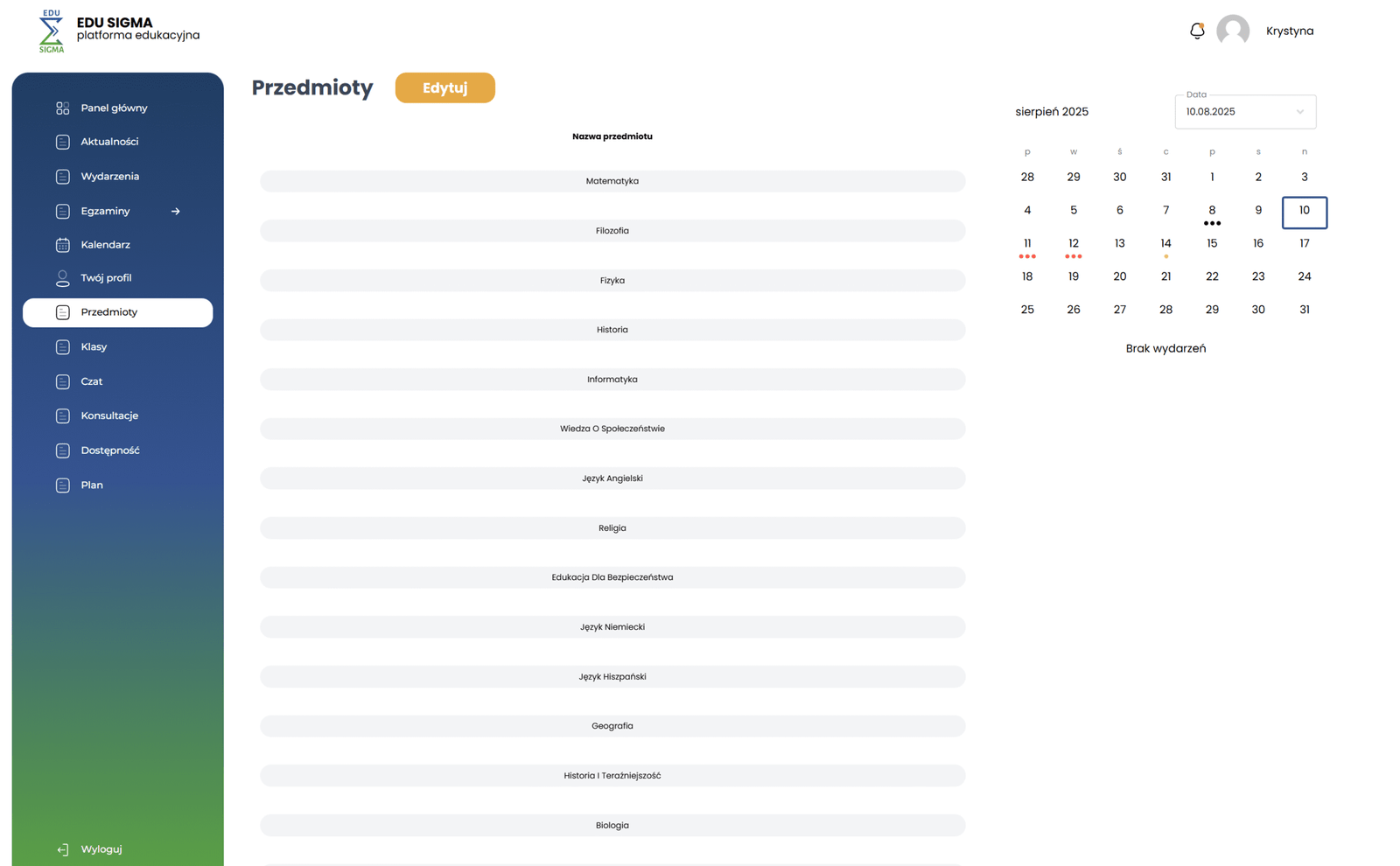 W zakładce „Przedmioty” nauczyciel widzi wszystkie przedmioty, do których został przypisany w danej szkole. Dla każdego przedmiotu może przeglądać szczegóły, pracować z przypisanymi materiałami, zarządzać kartami pracy, a także śledzić postępy uczniów w ramach konkretnego przedmiotu i klasy.