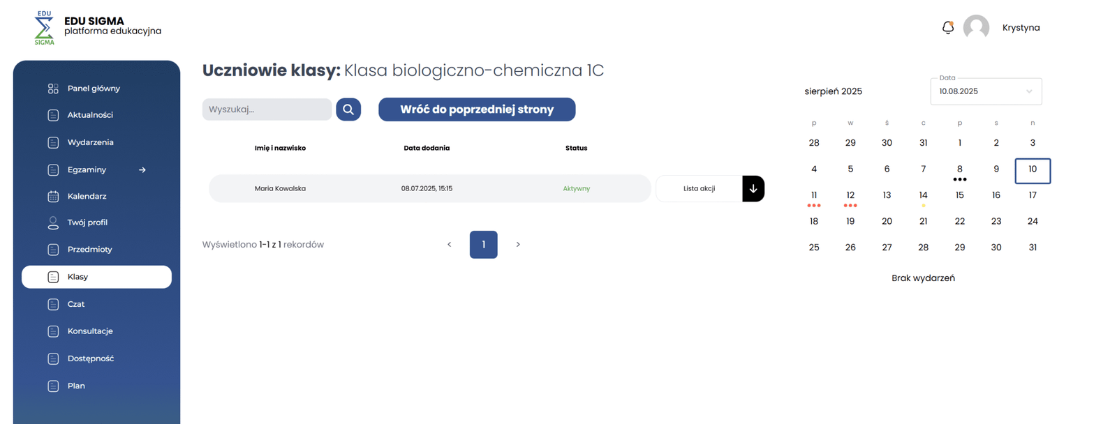 Przy każdej klasie widoczne są szczegóły, takie jak: nazwa klasy, nazwa szkoły, placówka, numer pomieszczenia oraz status. Nauczyciel może przejść do listy uczniów przypisanych do danej klasy i sprawdzić indywidualne informacje.