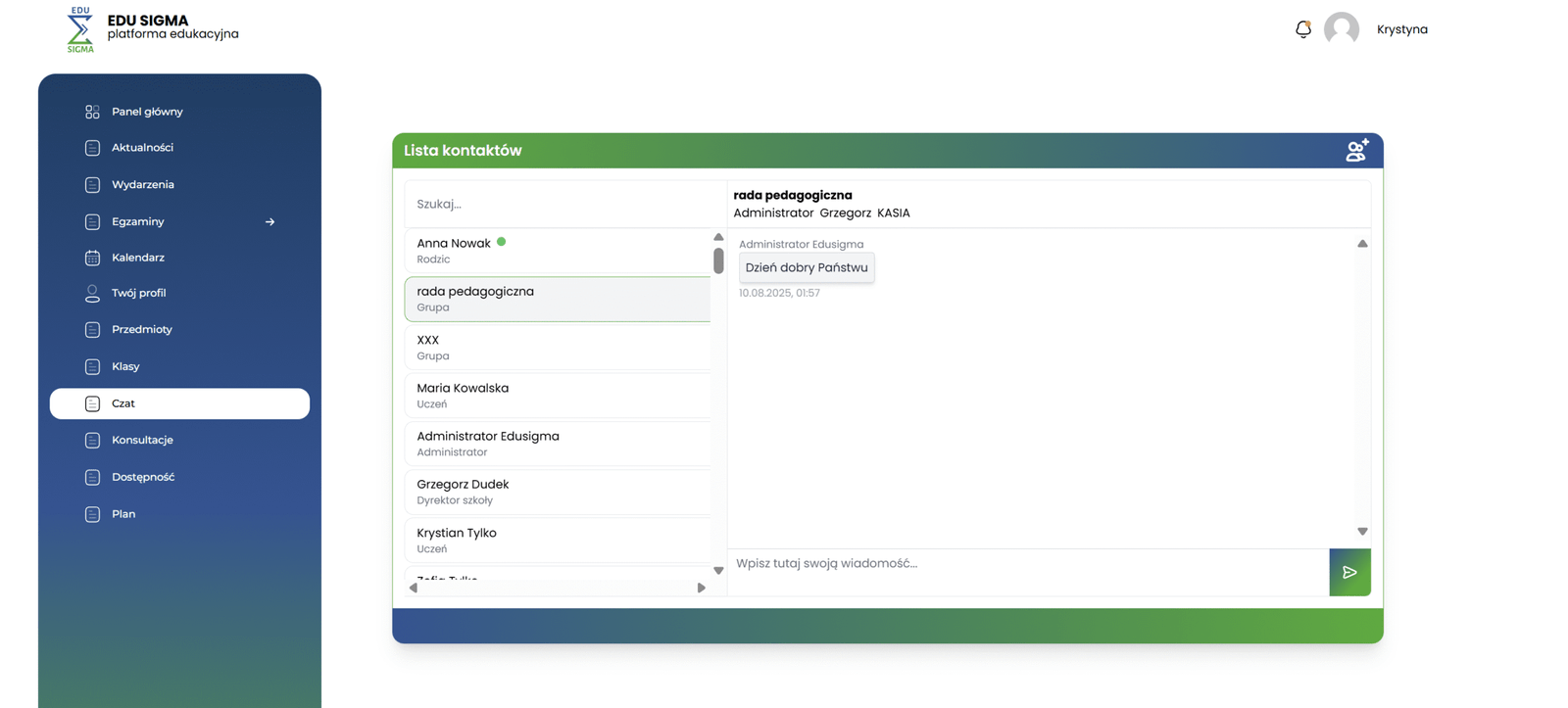 Zakładka „Czat” umożliwia nauczycielowi prowadzenie bezpośredniej komunikacji z uczniami, rodzicami oraz innymi pracownikami szkoły. Wiadomości przesyłane są w czasie rzeczywistym, z możliwością dodawania załączników i przeglądania historii rozmów.
