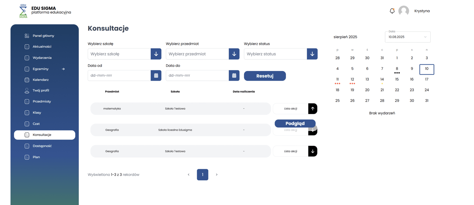 Po kliknięciu w podgląd konsultacji, nauczyciel może zobaczyć szczegóły spotkania, w tym czas trwania i formę zajęć. Dodatkowo system umożliwia filtrowanie konsultacji według przedmiotów, statusu, szkół oraz zakresu dat, co ułatwia zarządzanie i kontrolę nad prowadzonymi zajęciami.