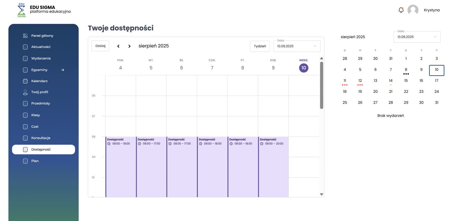 W zakładce „Dostępność” nauczyciel może określić i edytować godziny, w których jest dostępny do prowadzenia zajęć, konsultacji lub innych aktywności szkolnych. System prezentuje każdy dzień tygodnia wraz z aktualnie ustawioną dostępnością.