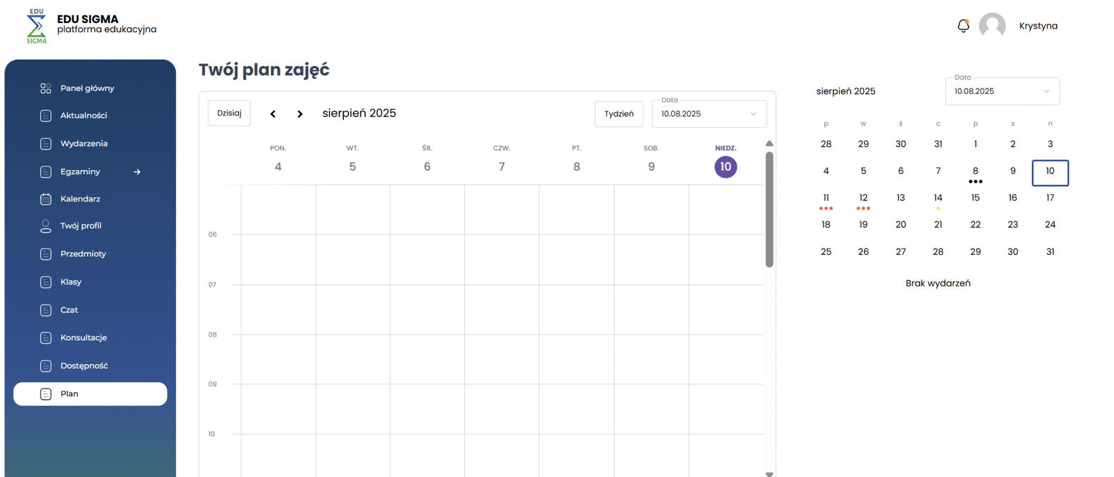 Każdego dnia wyświetlana jest lista lekcji z informacjami o przedmiocie, godzinie oraz klasie, w której odbywają się zajęcia. To przejrzysty widok, który pozwala szybko zorientować się w rozkładzie obowiązków i zaplanować dzień pracy.