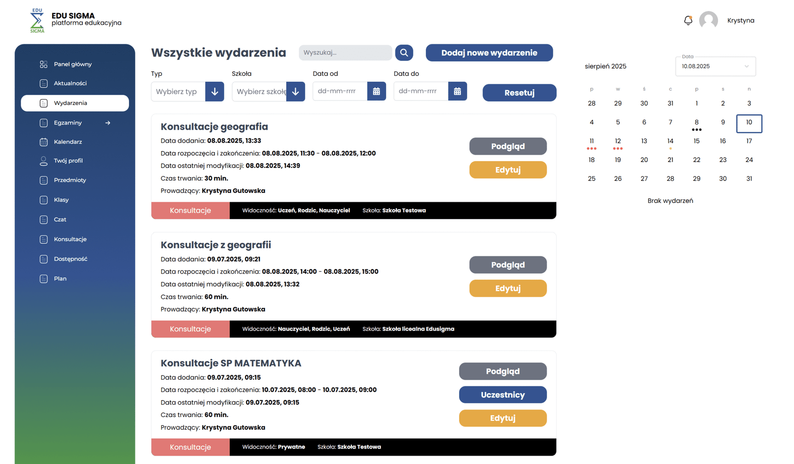 Po zapisaniu wydarzenia nauczyciel ma dostęp do jego szczegółów: listy uczestników, danych prowadzącego, możliwości edycji lub usunięcia wydarzenia. System pozwala również filtrować wydarzenia według ich typu (np. konsultacje, warsztaty, spotkania), przypisanej szkoły lub daty dodania.