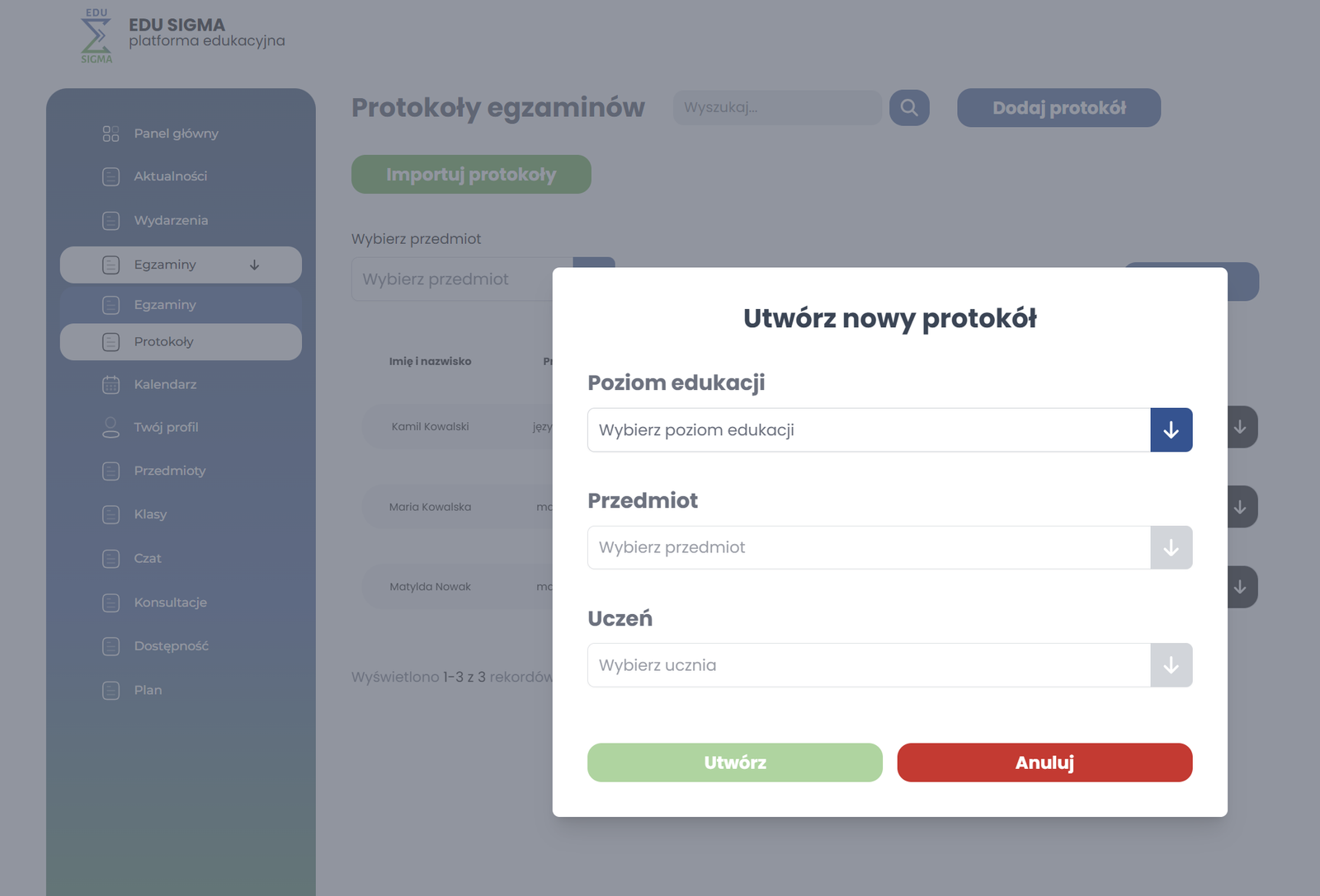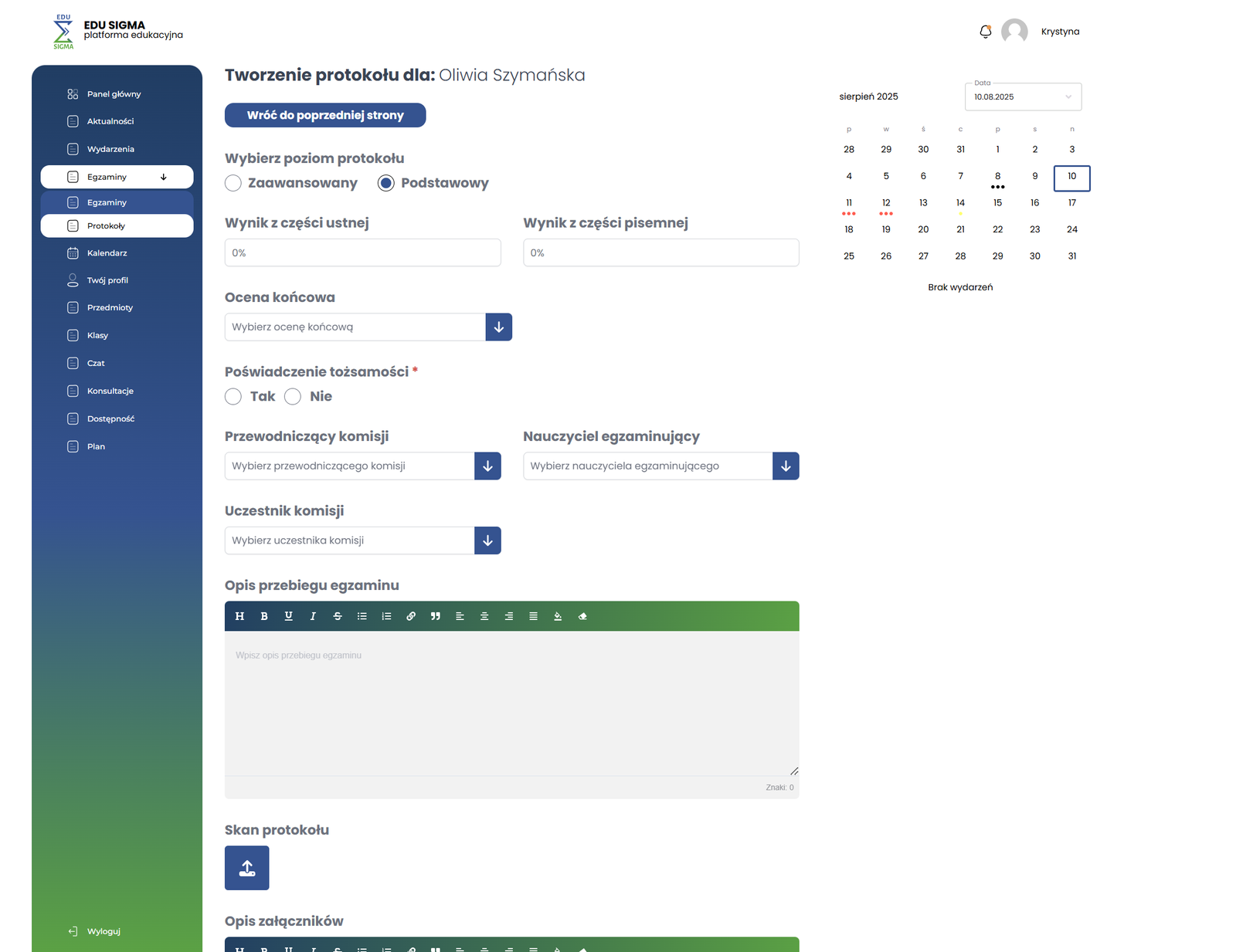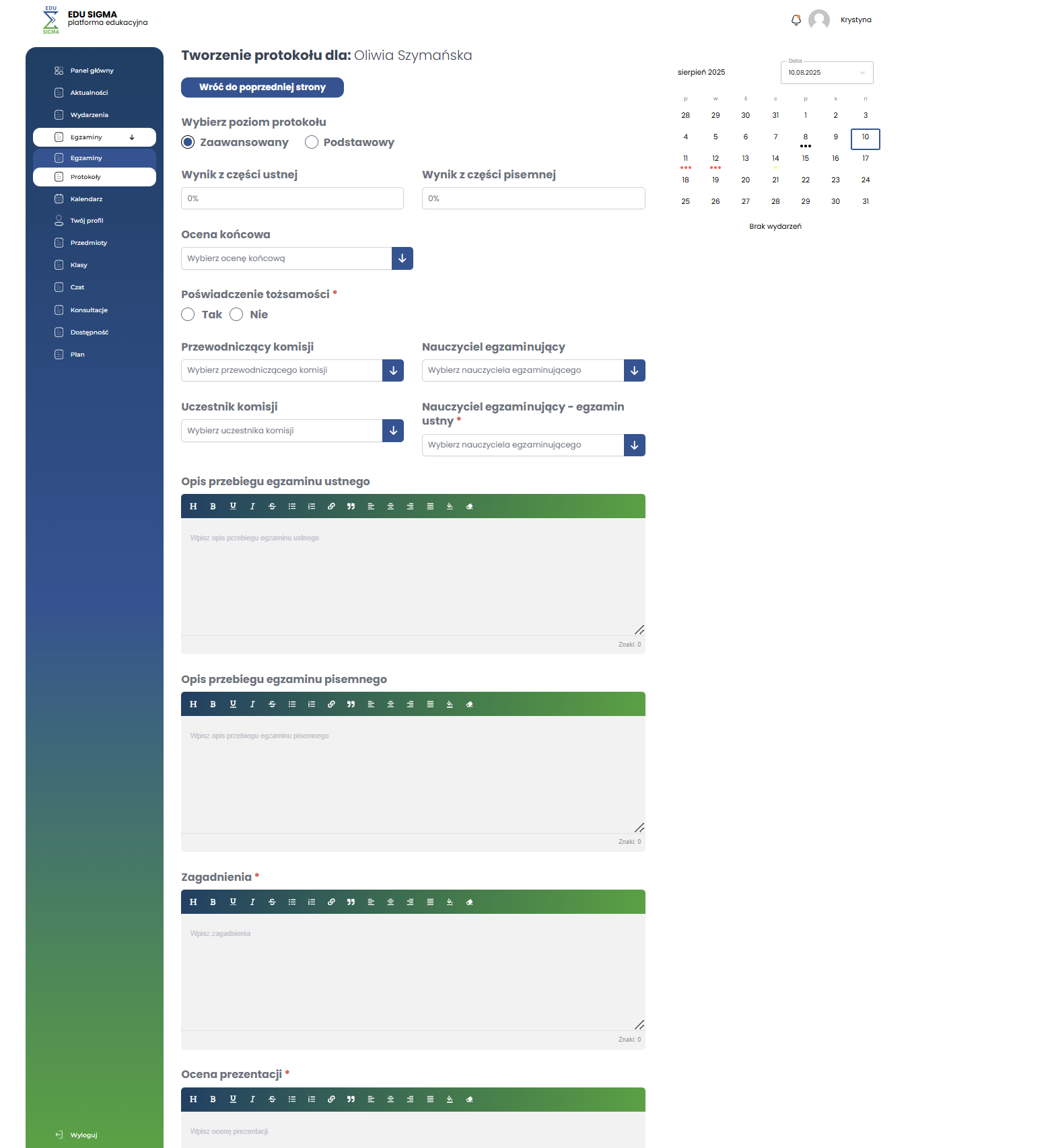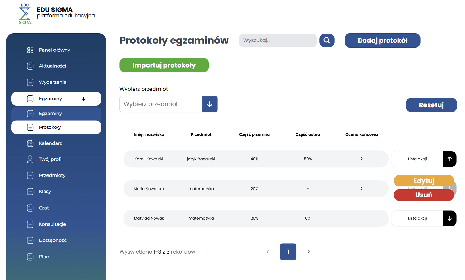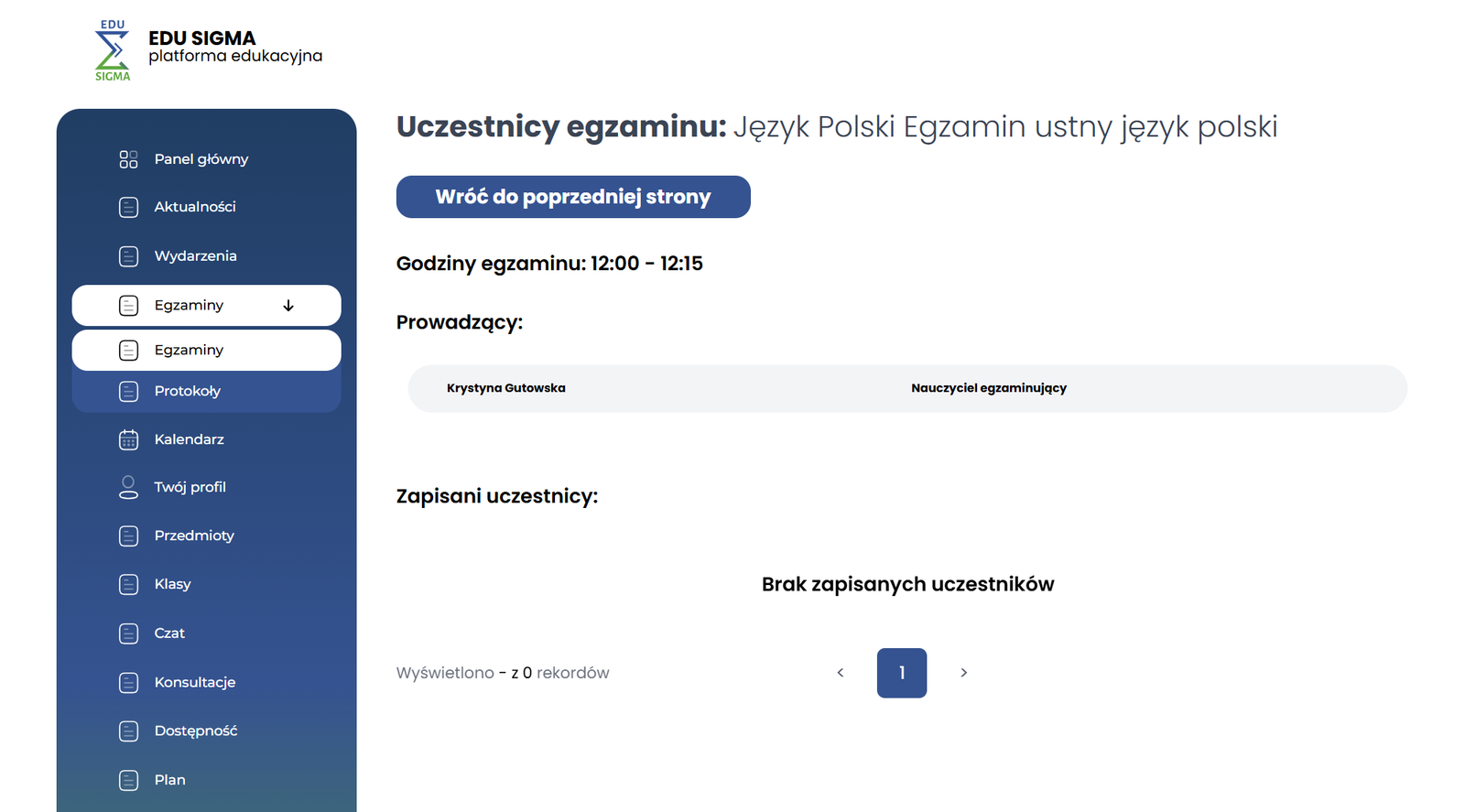 Zakładka „Egzaminy” umożliwia nauczycielowi kompleksowe zarządzanie przeprowadzonymi egzaminami oraz protokołami egzaminacyjnymi.