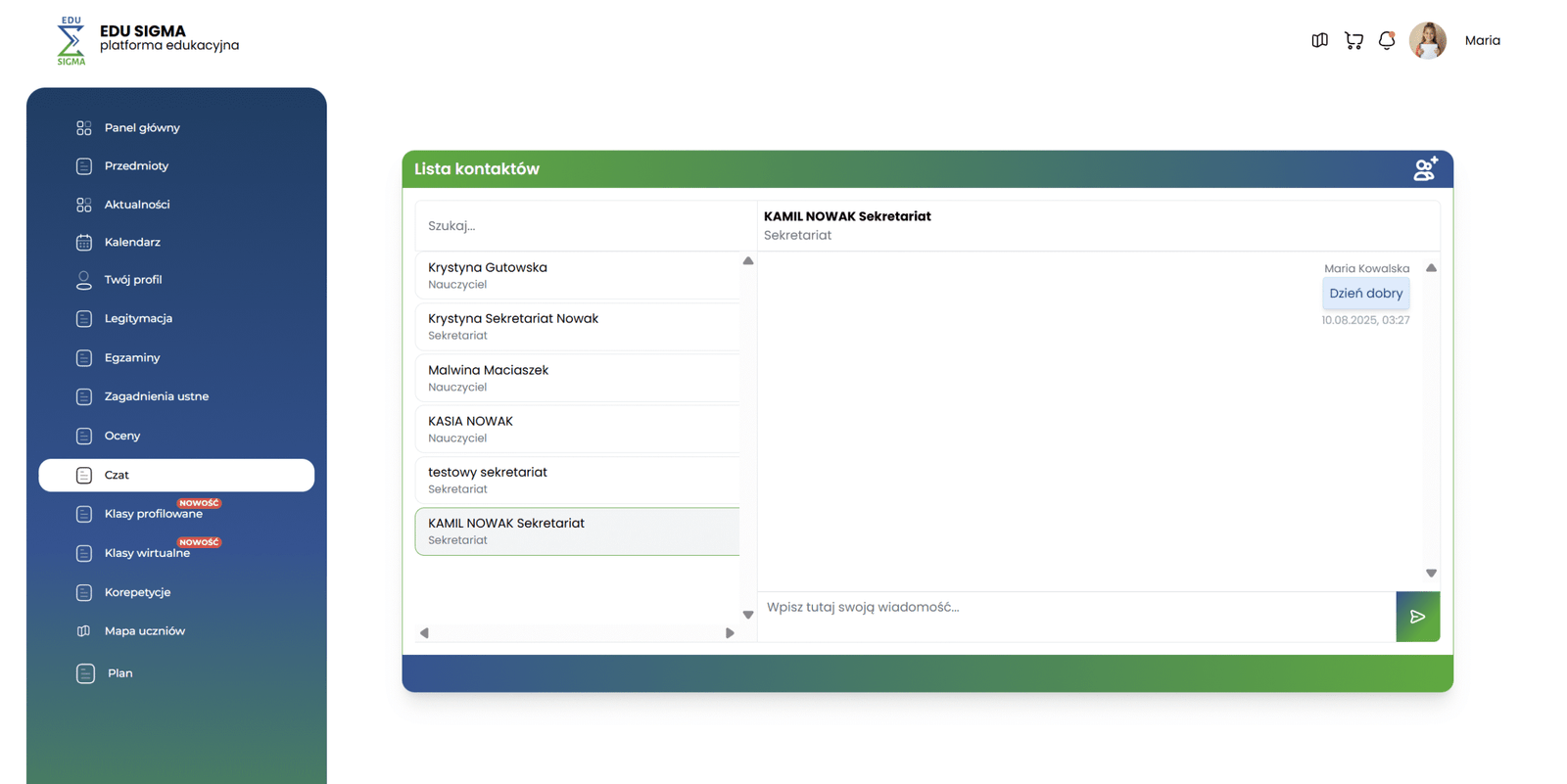 Masz pytanie do nauczyciela? A może chcesz sprawdzić ważną informację od sekretariatu? Wszystko znajdziesz w zakładce „Czat”!