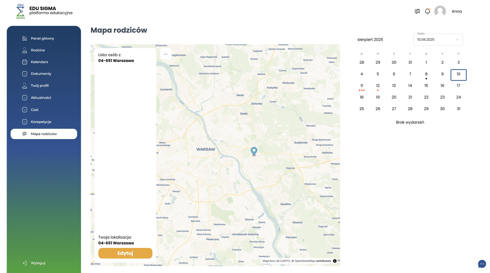 Dane lokalizacyjne są pokazywane w sposób ogólny – nie zawierają dokładnego adresu, a jedynie rejon wynikający z kodu pocztowego. Dzięki temu funkcjonalność pozwala zorientować się, gdzie są inni uczniowie, bez naruszania prywatności.