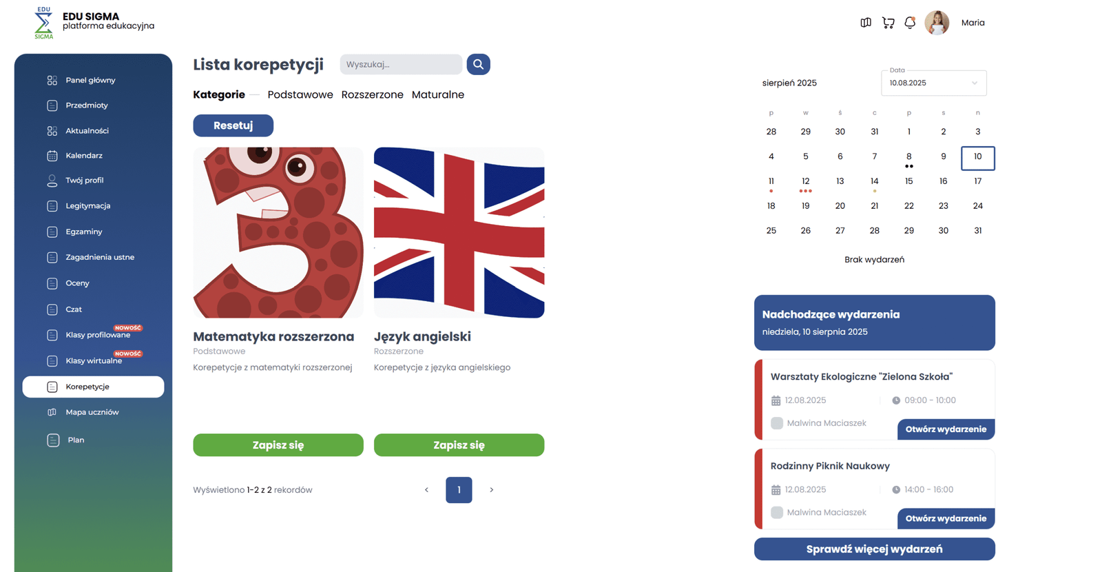 - Zobaczysz, z jakich przedmiotów są dostępne zajęcia dodatkowe