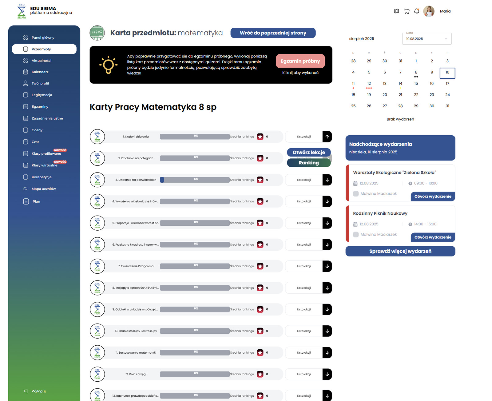 - Przeglądać listę dostępnych egzaminów z każdego przedmiotu