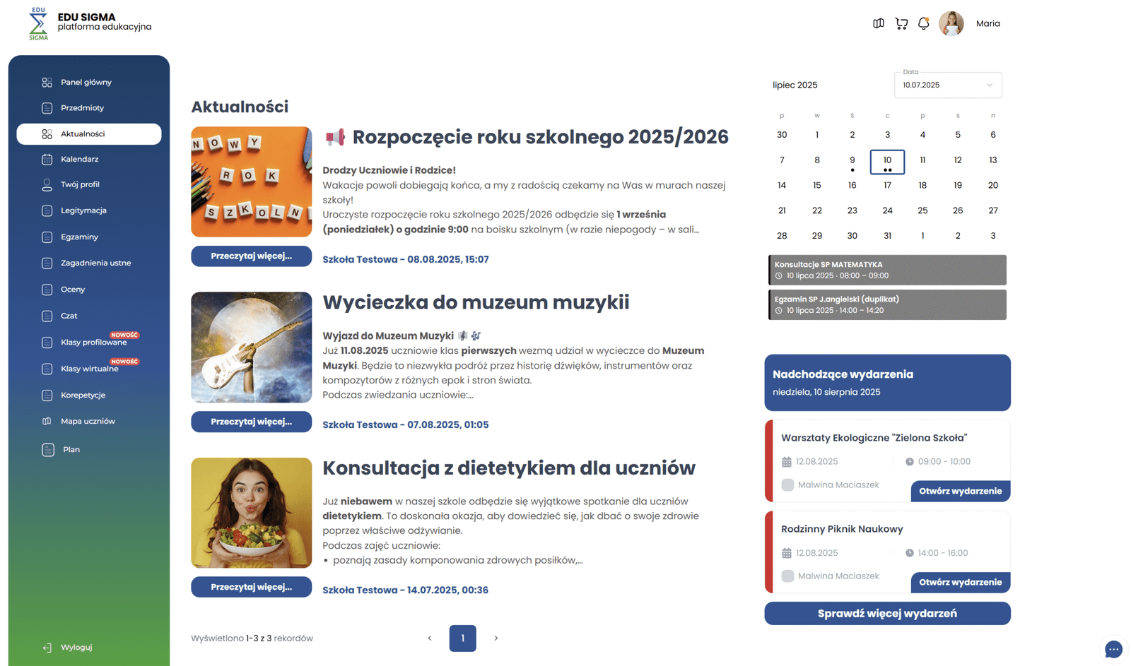 Wszystkie aktualności są przygotowywane przez szkołę – nie musisz niczego szukać samodzielnie. Po prostu otwierasz zakładkę i widzisz, co ważnego dzieje się w Twojej szkole.