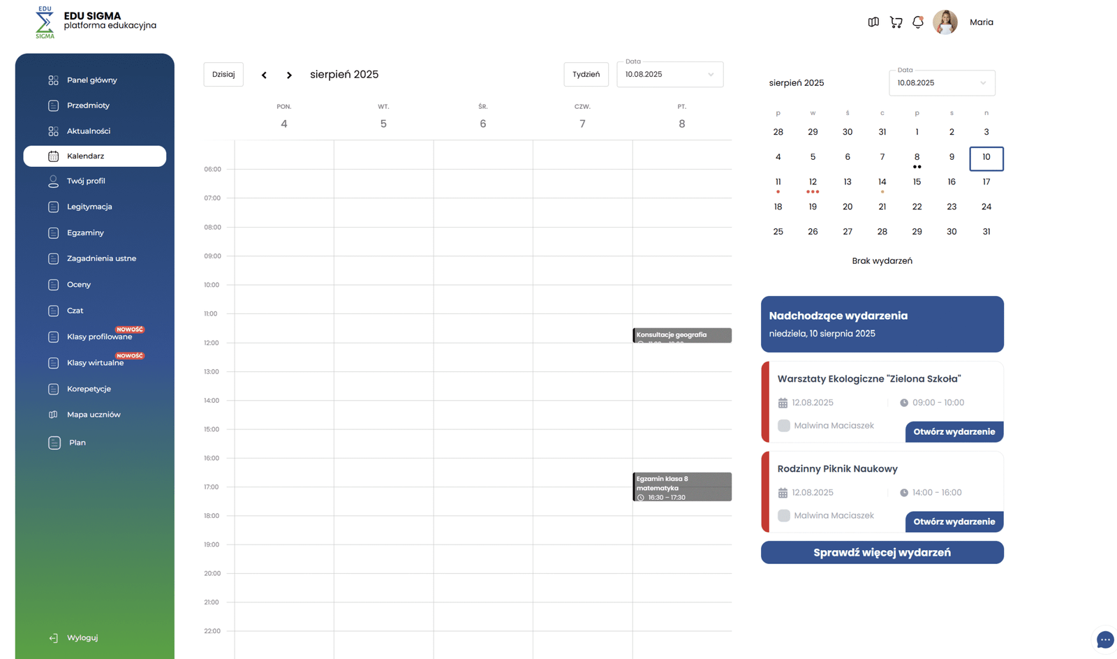 W zakładce „Kalendarz” zobaczysz wszystko, co dotyczy Twojej szkoły w czytelnym widoku dziennym, tygodniowym lub miesięcznym. To Twoje osobiste centrum informacji o tym, co, kiedy i gdzie się wydarzy.