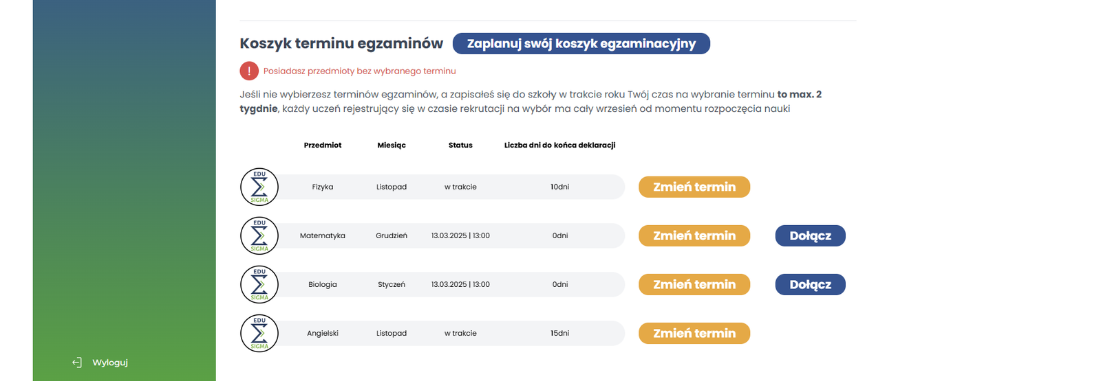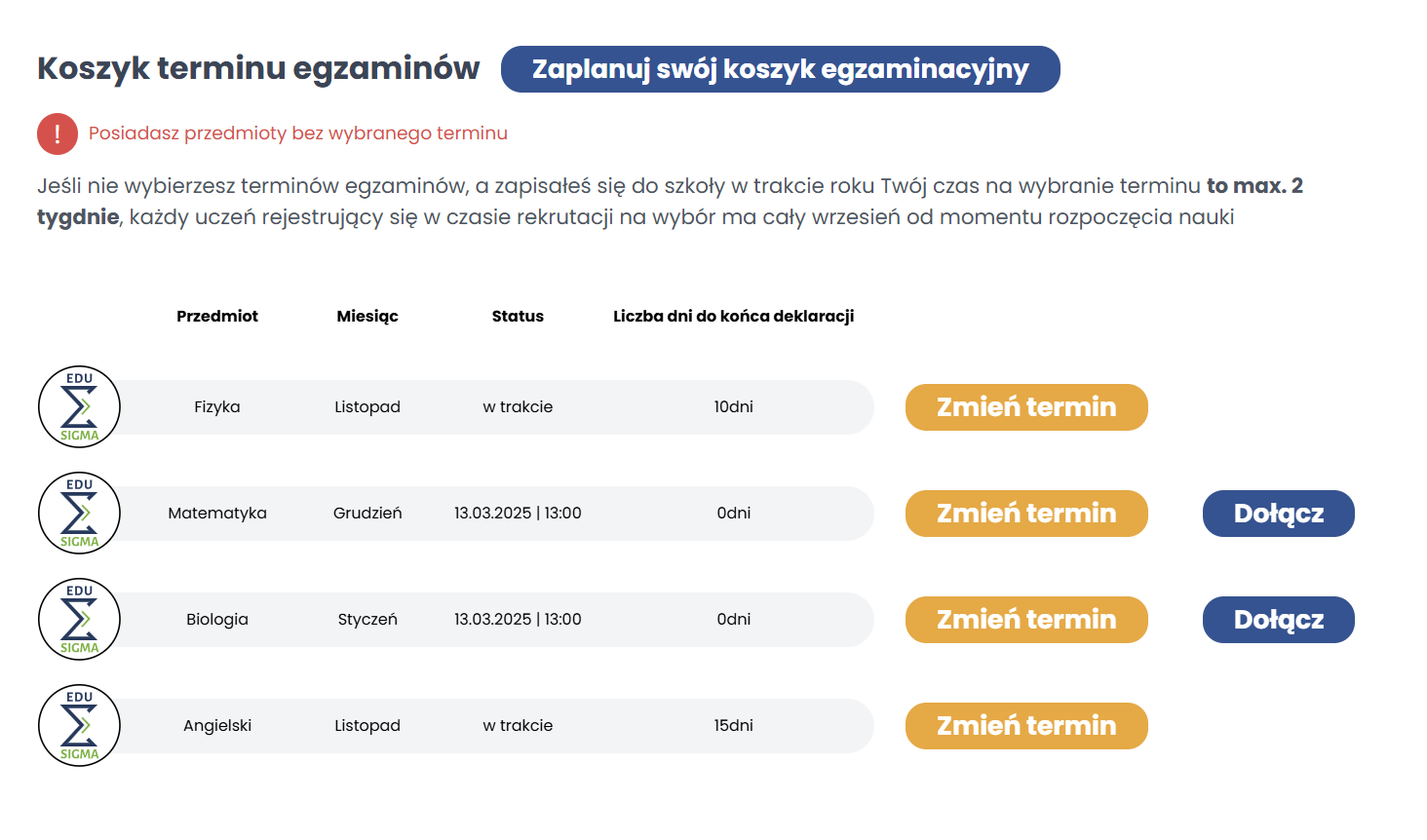 W „Koszyku Przedmiotów” możesz samodzielnie zdecydować, w których miesiącach chcesz podejść do egzaminu ustnego i pisemnego z każdego przedmiotu.