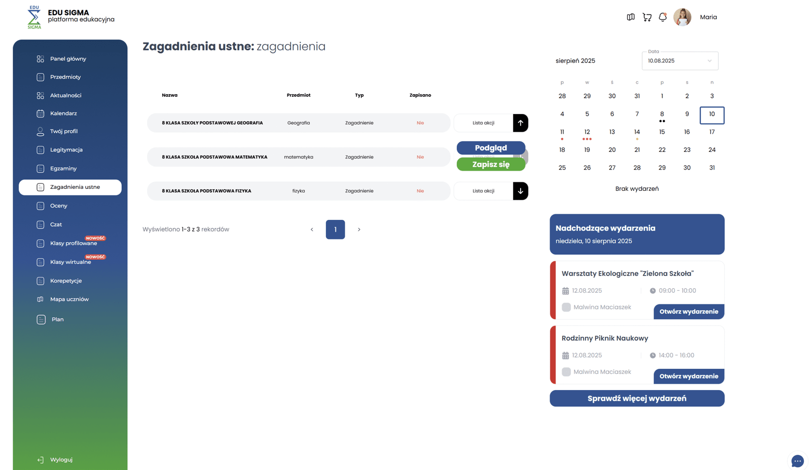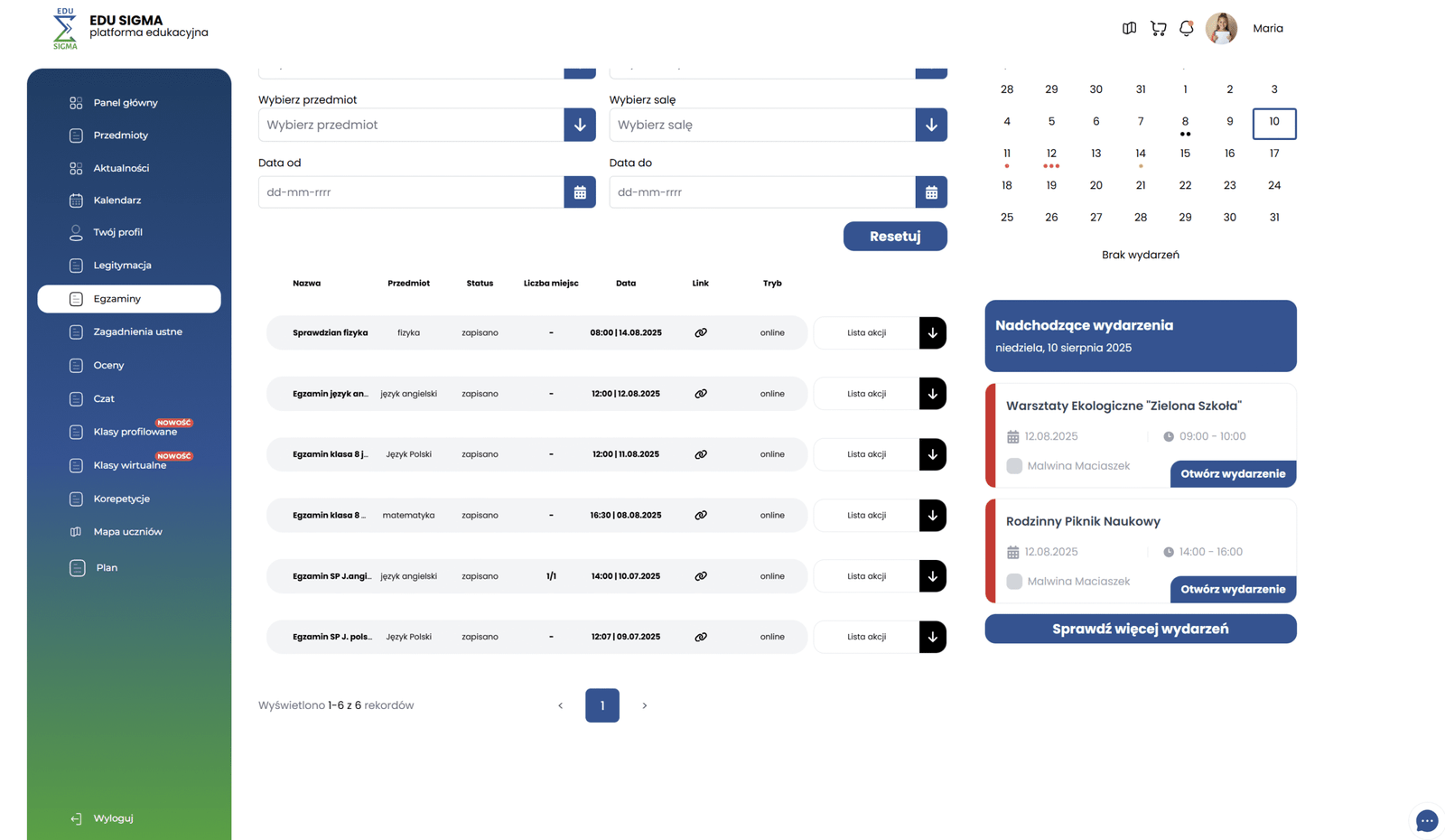 To tutaj znajdziesz wszystkie dostępne terminy egzaminów, na które możesz się zapisać – zarówno pisemnych, jak i ustnych.