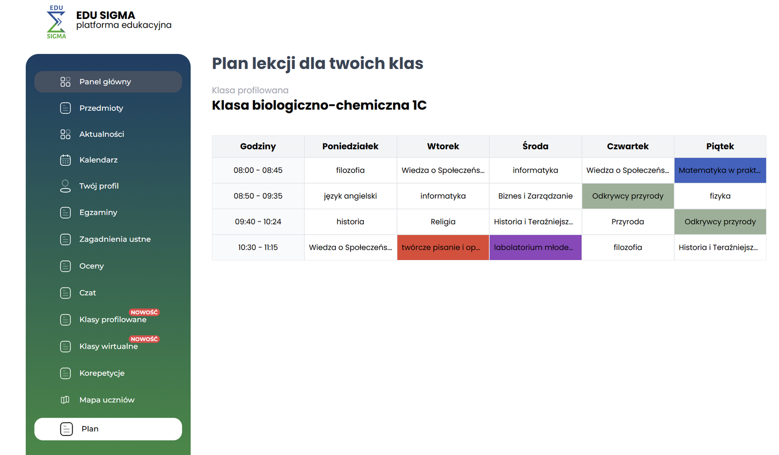 - widzisz rozpisane lekcje na każdy dzień tygodnia, z godzinami, nazwą przedmiotu i ewentualną salą lub linkiem do zajęć online,
